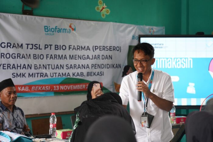 INFOFILANTROPI.COM, BEKASI (13 November 2025) — PT Bio Farma (Persero) bersama Kimia Farma dan Indofarma kembali menunjukkan peran nyata sebagai BUMN yang berkomitmen terhadap pembangunan masyarakat melalui penyelenggaraan Program Kolaborasi Pendidikan “Bio Farma Mengajar” di SMK Mitra Utama, Kecamatan Sukatani, Kabupaten Bekasi. Inisiatif ini bertujuan memperkuat ekosistem pendidikan vokasi sekaligus meningkatkan pemahaman kesehatan bagi remaja.