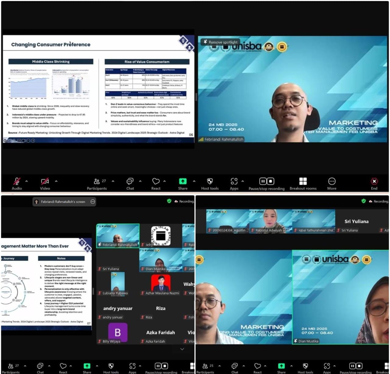 INFOFILANTROPI.COM, BANDUNG (24 Mei 2025) – Dalam rangka memperkuat pemahaman mahasiswa terhadap isu-isu kontemporer dalam manajemen bisnis, Program Studi Magister Manajemen Fakultas Ekonomi dan Bisnis (FEB) Universitas Islam Bandung (Unisba) mengadakan kegiatan Guest Lecture bertajuk: “Marketing: Providing Value to Customers”, pada hari Sabtu, 24 Mei 2025, pukul 07.00 – 08.40 WIB secara daring (online).
